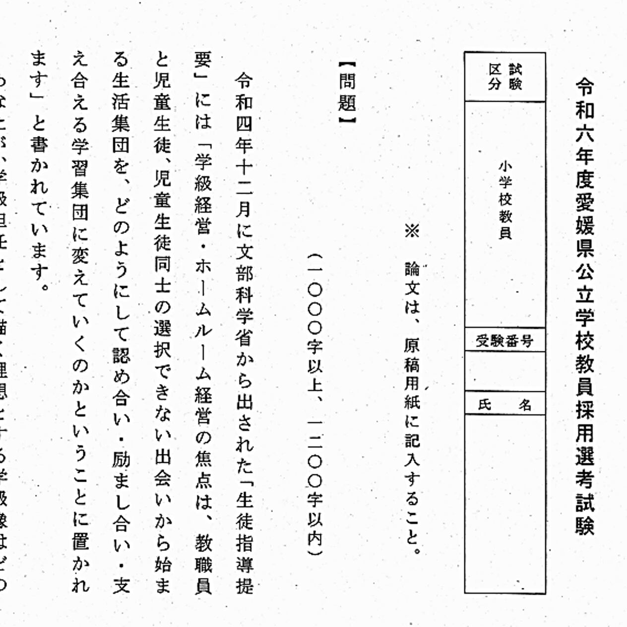 ●小論文試験の問題(小学校)(全1ページ)
