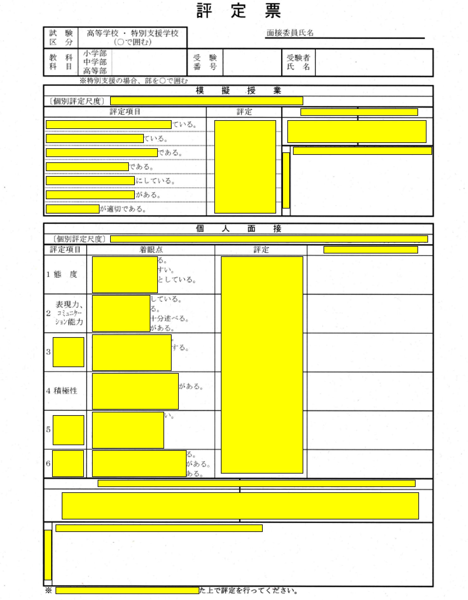 模擬授業と個人面接の評定項目、着眼点、その他の記入項目がわかります。